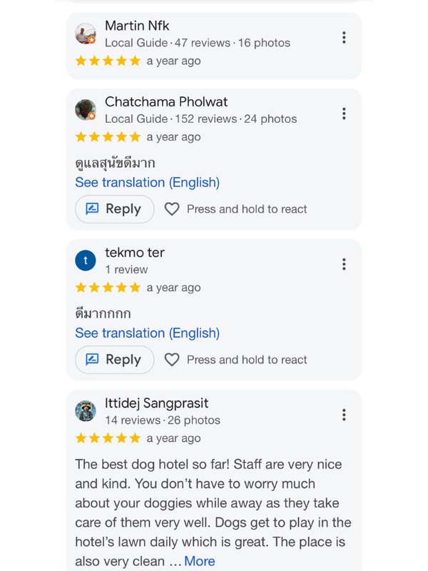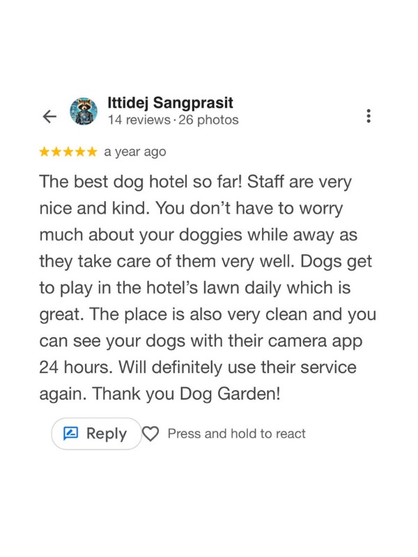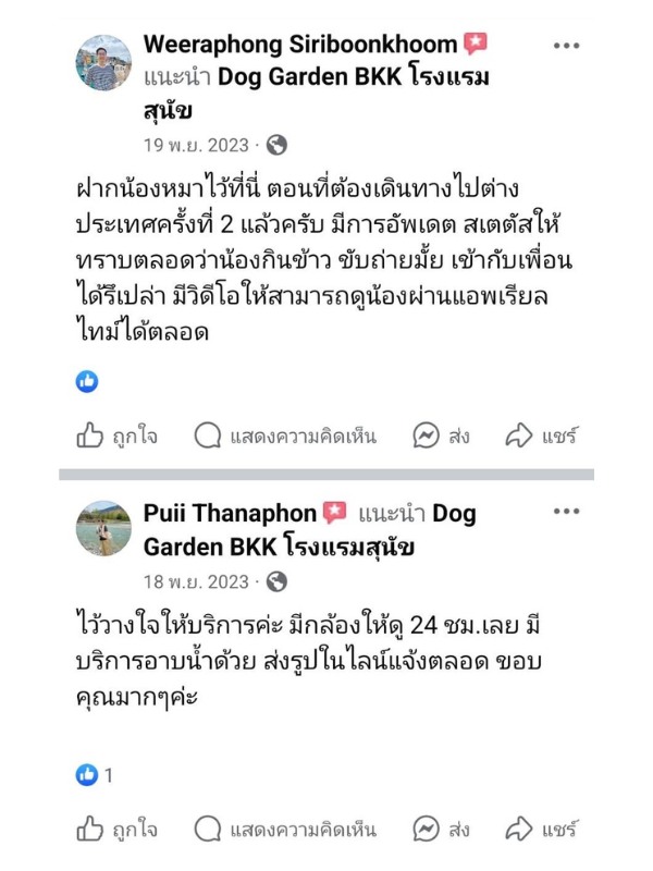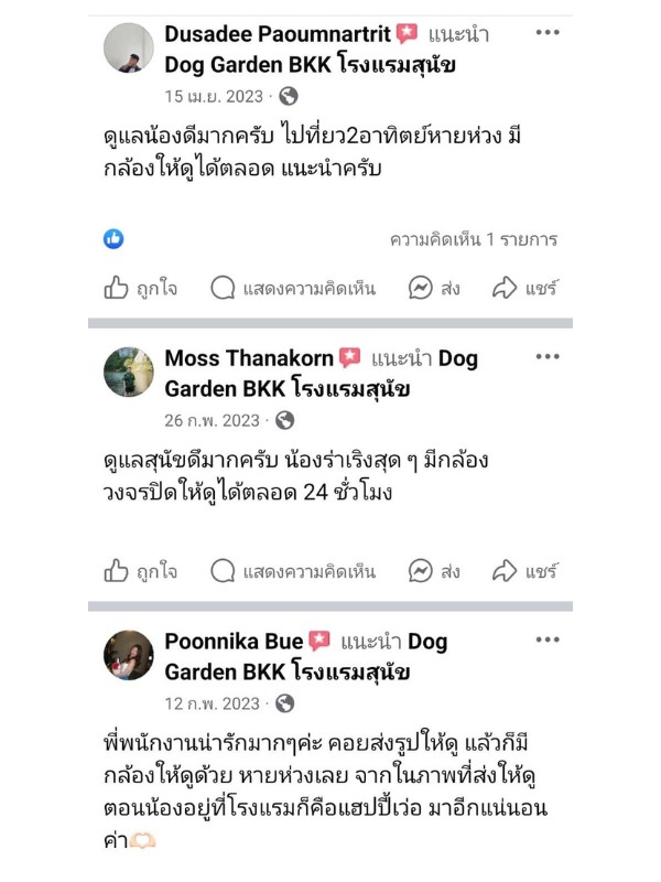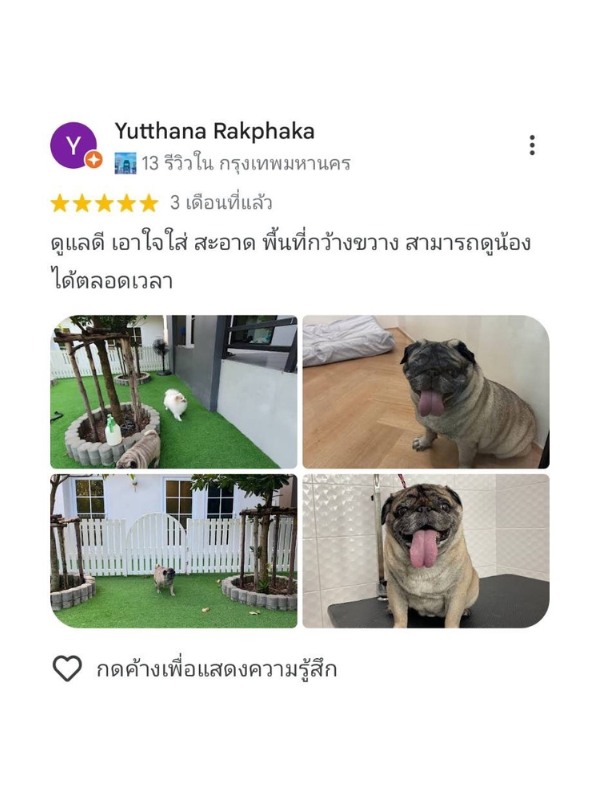 ลองเช็คดูหลายที่ สุดท้ายมาจบที่ โรงแรมสุนัข DOG GARDEN BKK แถวตลิ่งชัน จากบางแคมาไม่ไกล ส่วนบ้านญาติอยู่แถวราชพฤกษ์ นนทบุรี ก็มาไม่ไกล ติดใจที่นี่มาใช้บริการหลายรอบแล้ว บอกต่อเพื่อนๆ คือถูกต้อง ดีย์เลยแหละ